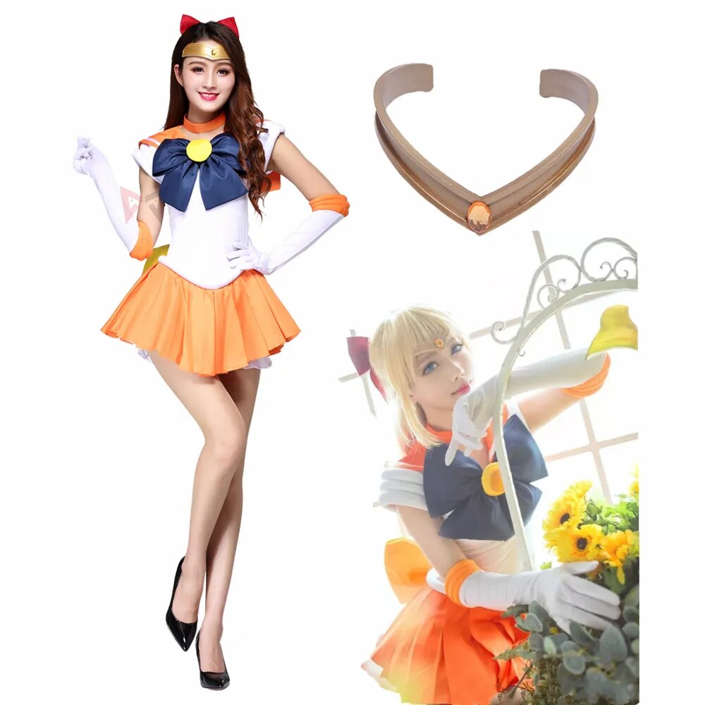 Disfraz de Sailor Venus de Sailor Minako Aino, vestido hecho a medida, diadema con lazo, guantes, horquilla para niños y adultos de talla grande