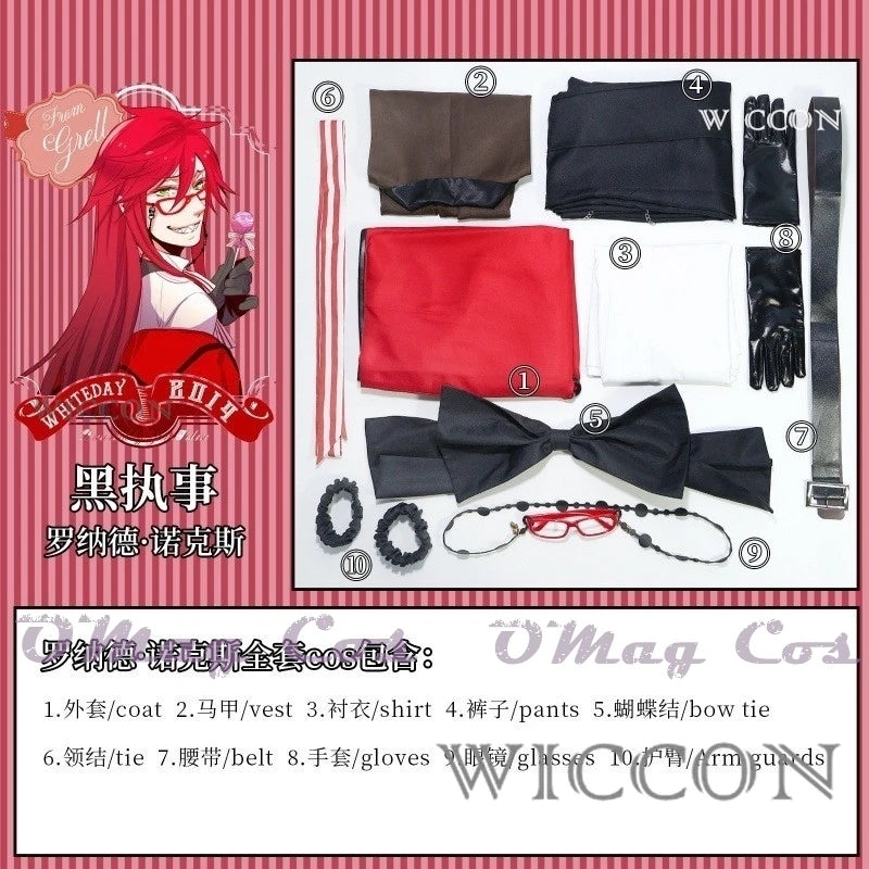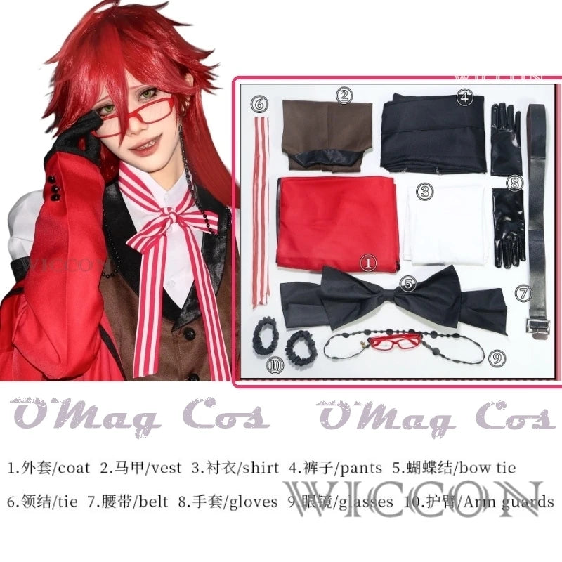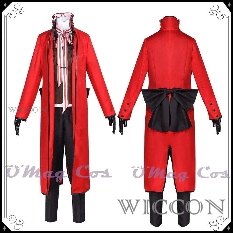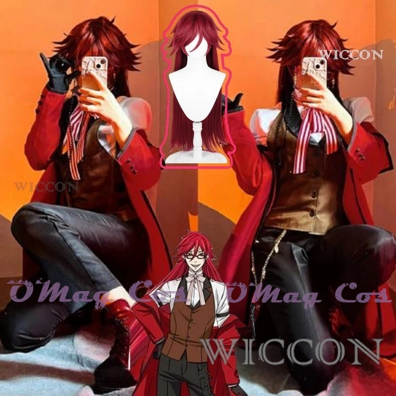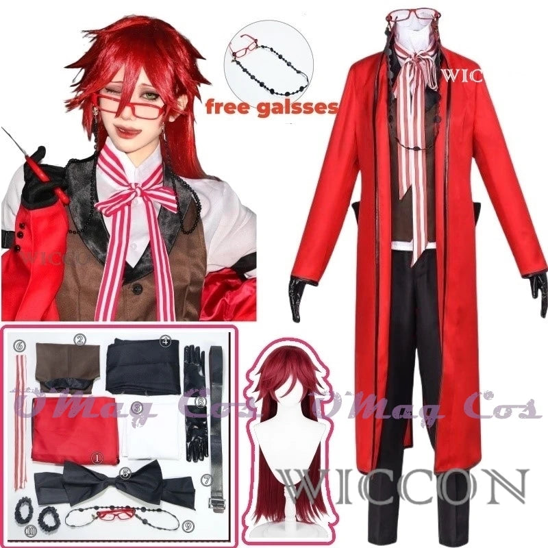 Black Butler Grell Sutcliff Michaelis Cosplay Costume Wig Uniforms Anime Cosplay Halloween Party Unisex Fancy Red Suit Glasses