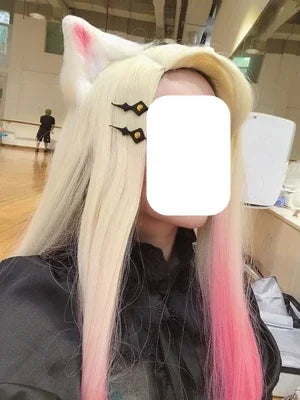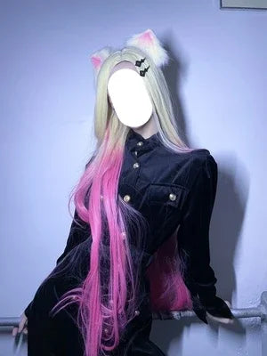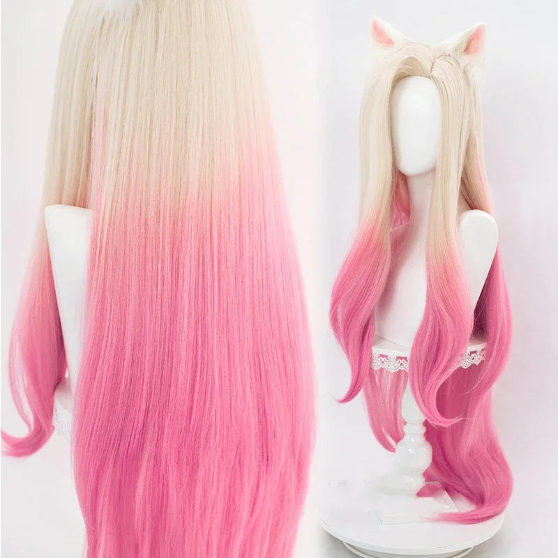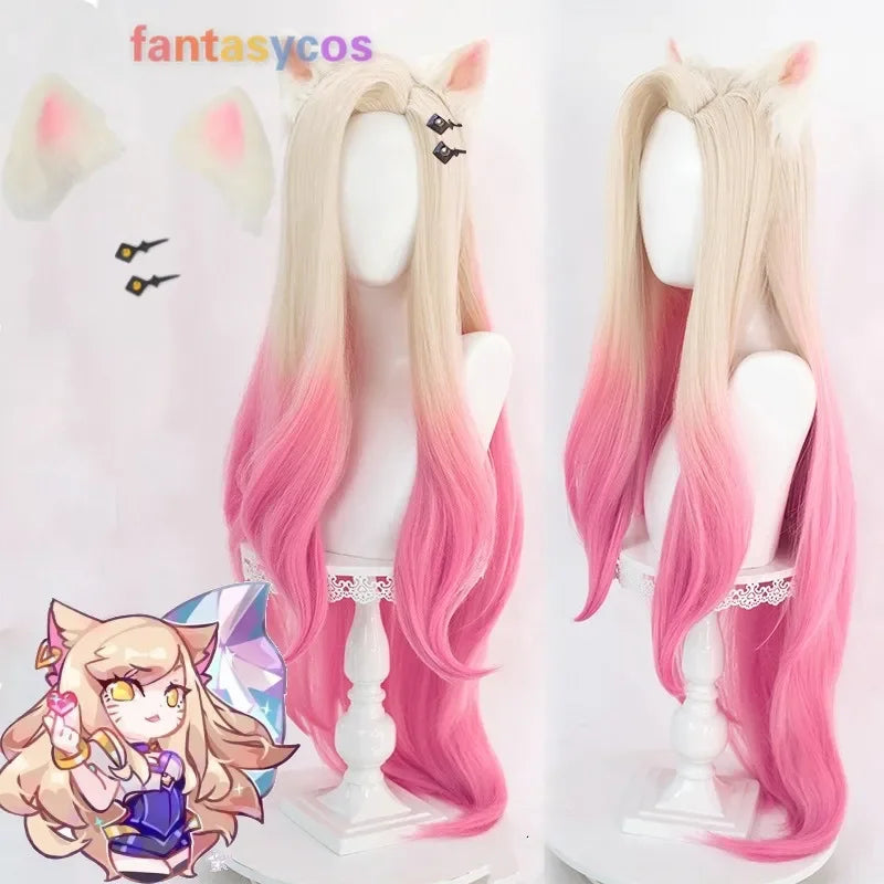 LoL KDA Baddest Ahri Cosplay Wig 100cm Long Blonde Pink Wavy with Ear Hairpin Synthetic Hair Role Play Halloween Party + Wig Cap